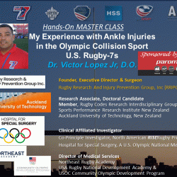 Furthermore, he presented a Masterclass on his experiences with ankle injuries in U.S. Rugby including the Northeast Olympic Development Academy, a USA Rugby and USOC development program. This will provide pearls of wisdom on athlete care and treatment to make a better practitioner from a “hands-on-perspective.” The knowledge conveyed will be on the heels of Dr. Lopez et al. just winning the 2017 Sports Medicine Australia- Best New Investigator in Sports Injury Prevention. On their teams analyses of “Injury rates of U.S. Rugby-7s an Olympic Collision Sport: Using a Novel Injury Surveillance Tool the RISERugby Report Methodology.”