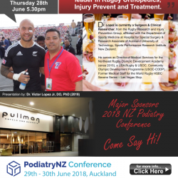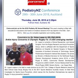 Victor Lopez Jr, is a SPRINZ/AUT Research Associate, and member of the Rugby Codes Research Group. He is a clinical researcher at Hospital for Special Surgery and Director of Medical Services for the Northeast Rugby Olympic Development Academy. He is honored to be a plenary speaker at the 2018 Podiatry New Zealand Conference, by its event sponsor “Paromed Inc“ a lower limb orthopaedic technologies based company in Australia and New Zealand.