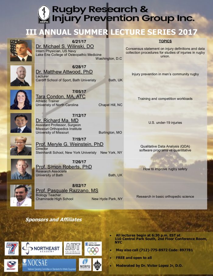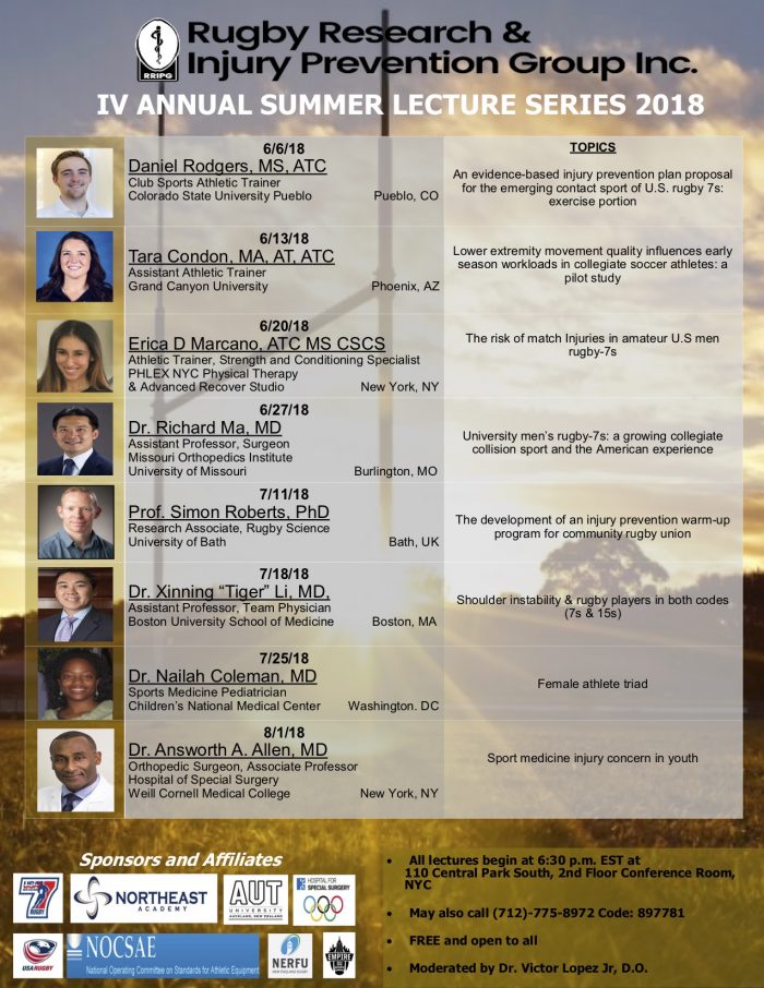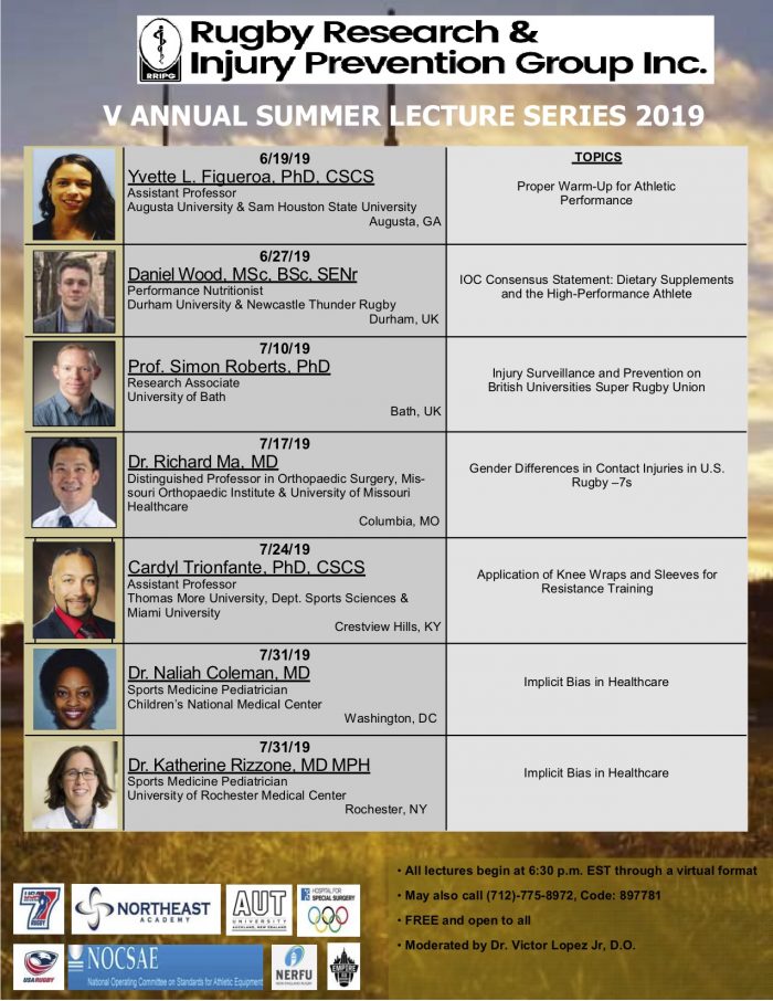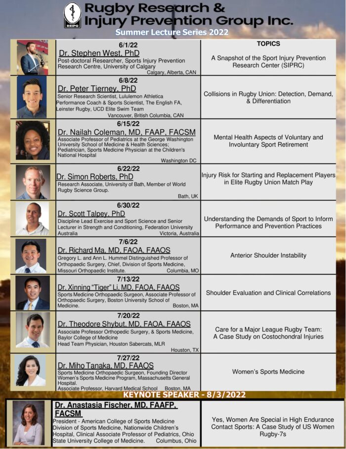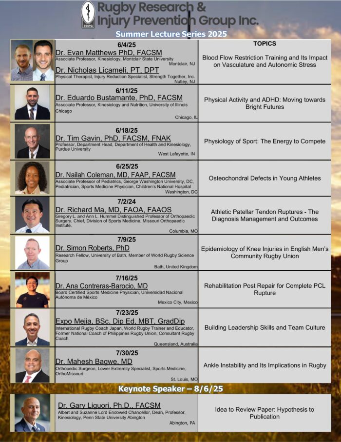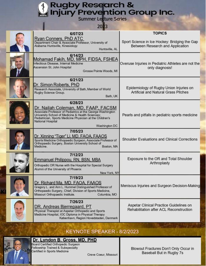 Over the years, RISE has had the honor of hosting our annual Summer Lecture Series (SLS). Exceptional doctors, athletic trainers, professors, and students are invited every Wednesday between the months of June-August to share their knowledge in the sports medicine field. RISE thanks all of our presenters for joining us in person and virtually. We also have some of our summer interns share a research study during our Journal Club session. The annual SLS is available to all! Simply call (712)-775-8972 and the code is 897781. If you ever miss a SLS, we have recordings on our YouTube channel.