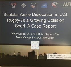 In 2018 the Rugby Research and Injury Prevention Group will be presenting on Rugby-7s injuries in U.S. Non-time-loss injuries in our population. Dr. Lopez will also be keynote-presenting a case study on a Rugby-7s injury, which will be on an Ankle Injury.