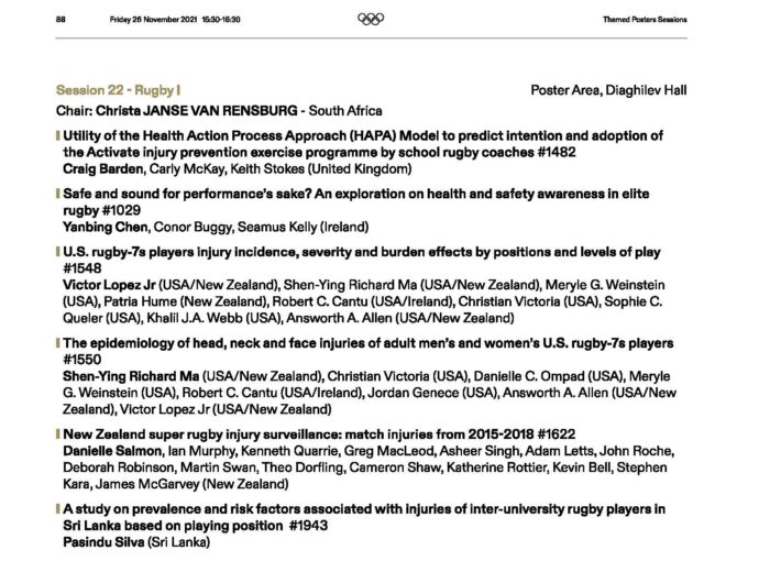 This year the honorable injury prevention specialist Professor Patria A. Hume PhD helped contribute to our 2021 Workshop on Rugby-7s Injury Prevention. Meanwhile, the foremost neurosurgical trauma specialist, Dr. Robert C. Cantu MD contributed to our Thematic Presentations. These abstracts presented, have been published in the British Medical Journal, British Journal of Sports Medicine, the foremost medical journal on rugby studies.